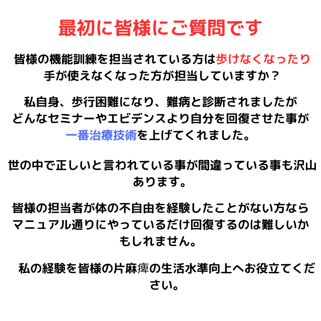 | Q.どのような症状でご来院されましたか? A.麻痺の改善に向けてリハビリの方法がわからずに手順を知りたい。 Q.麻痺歴何年でお願いしますか? A.30年以上です。原因が調べてもわからなくて若いから回復するだろうみたいな期待があったけどやり方がわからなくて進歩がなかったです。 Q. さまざまなリハビリ施設の経験がありますが、他の場所との違いを教えてください。 A.動画記録してもらってから客観的に自分がどういう状況か確認できる。 Q.以前もリハビリに行ってましたが動画にしてくれなかったのですか? A.動画はなかったです。以前の場所は担当の方が覚えていてくれてやっていたが違う場所に行った方がいいんじゃないかと思いここにたどり着きました。 Q.なにを見てご来院されましたか? A.グーグルの検索です。 Q.他院は調べましたか? A.候補はありましたが通える範囲、あとは値段です。 Q.片麻痺の方にメッセージやアドバイスをお願いします。 A.どうしても希望を捨てがちになってしまいますが、つきなみですが諦めなければ道は開けないなと。 |